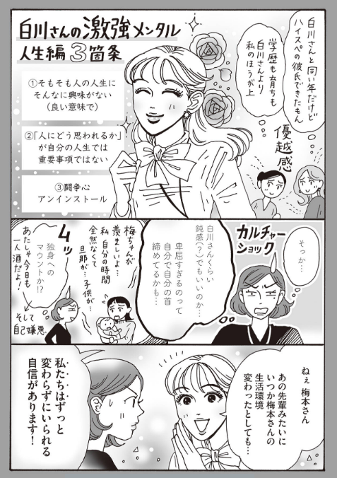 白川さんは絶対にそんな生活は送らない。なぜなら自分にとっての幸せを第一に考えるからだ。白川さんのメンタルの強さはかつての経験から来るもので、己の価値観を信じている。他人の意見に呑まれず、相手の悪意もさらりとかわす。そのコツがこちら。
